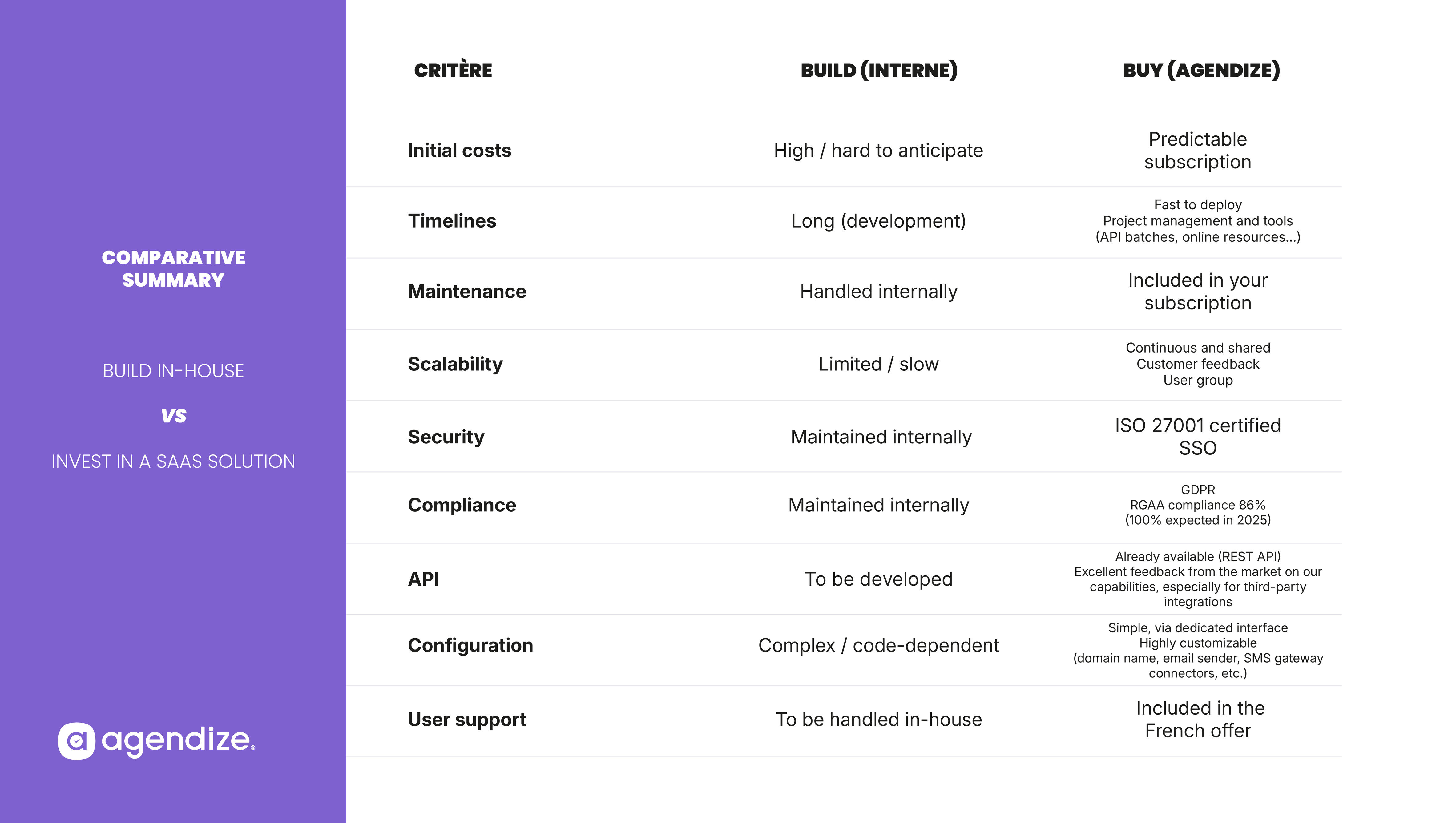 Are you hesitating between in-house development and a market solution? It may be useful to compare your hypotheses with an objective benchmark, or to talk to experts who have managed this type of project in environments similar to yours. The right choice rarely depends on a single criterion; it lies in the balance between control, efficiency, total cost and scalability.